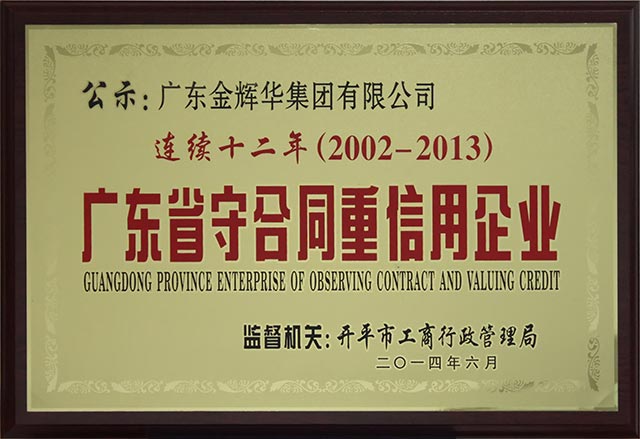 日前,我集團公司順利通過廣東省工商行政管理局的考核公示,被授予“連續(xù)十二年(2002-2013)廣東省守合同重信用企業(yè)”榮譽稱號,以表彰我司在守信經(jīng)營、誠信經(jīng)營方面的優(yōu)秀表現(xiàn)。我集團公司一貫高度注重誠信體系建設(shè),不斷規(guī)范合同管理,著力打造企業(yè)誠信品牌,大力加強企業(yè)自身的信用建設(shè),秉承了“團結(jié)、敬業(yè)、誠信、創(chuàng)新”品牌形象。連續(xù)十二年榮獲“廣東省守合同重信用企業(yè)”這項殊榮是我集團公司企業(yè)誠信經(jīng)營的成果