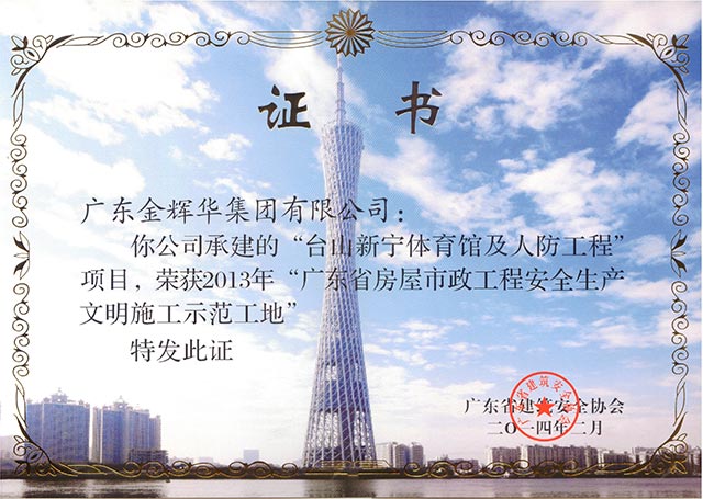 熱烈慶祝我公司“臺山市新寧體育館及人防工程”榮獲廣東省房屋市政工程安全生產文明施工示范工地。