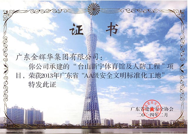 熱烈慶祝我公司“臺山市新寧體育館及人防工程”榮獲AA級安全文明標準化工地。