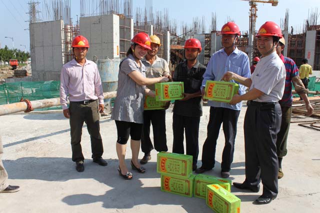 貫徹安監(jiān)總局辦公廳、衛(wèi)生部辦公廳、人力資源和社會保障部辦公廳、中華全國總工會辦公廳關(guān)于進一步做好夏季防暑降溫工作的通知精神,保障我公司集團員工在高溫天氣情況下安全順利的開展各項施工工作,公司黨委書記張解矛、工會副主席高迎春、行政中心副主任梁沛瑩、工程管理中心鄭國燦等同志于7月23日下午來到了金輝華綜合大樓施工現(xiàn)場,對一線施工人員在炎熱高溫環(huán)境下工作的情況進行了親切的慰。