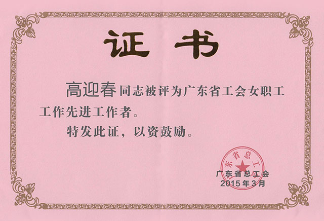 ——記我司工會副主席高迎春同志被評為廣東省工會女職工工作先進工作者近日,廣東省總工會召開了表彰2009-2014年在工會女職工組織中作出突出成績的先進集體和個人大會,我司工會副主席、女職委主任高迎春同志在會上被授予廣東省總工會“女職工工作先進工作者”榮譽稱號。高迎春同志自擔任金輝華集團工會副主席、女職委主任以來,主動協助工會主席,圍繞公司生產經營目標和企業戰略發展目標,積極開展女職工各項工作,著力