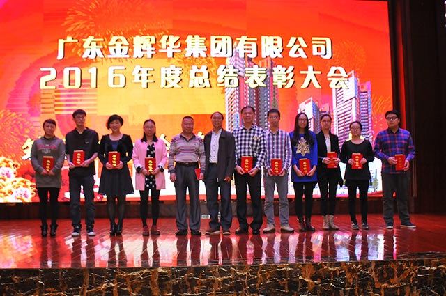 會議中董事局主席周珉興向所有員工發出了新春祝福!主席周珉興、董事長李甫、副總裁張國球、副總裁兼總工程師盧文權、副總裁兼黨委書記張解矛和團委書記譚翠瓊分別宣讀了表彰決定和優秀名單,并分別主持了公司工程優秀創優項目部、“2016省級工法”先進工作者、優秀員工、優秀黨員和優秀團員的表彰環節,領導們為他們頒發了榮譽證書,對他們所作出的成績進行了鼓勵,其中:表彰公司工程優秀創優項目部3個,“2016省級工法”先進工作者3名,優秀員工獎28名,表彰優秀黨員7名,優秀團員5名。最后由工會主席陳維民代表公司向受到表彰的各位同仁表示衷心的祝賀,向奮戰在各崗位的同事致以最真誠的感謝!并勉勵獲獎者們要珍惜榮譽、戒驕戒躁,把獲得的榮譽作為新的起點,在今后的工作中再做貢獻、勇創佳績!我們有理由堅信有這樣一批優秀的員工和團隊,在他們共同努力下,2017年將又是一個收獲的吉祥年。總結大會后,上演了一場歡天喜地的迎春晚會,晚會中,江門市建筑協會會長李耀南上臺作了重要講話,并充分肯定金輝華集團有限公司的成績,勉勵金輝華集團有限公司為重振開平建筑業雄風實現跨越發展再立新功。
