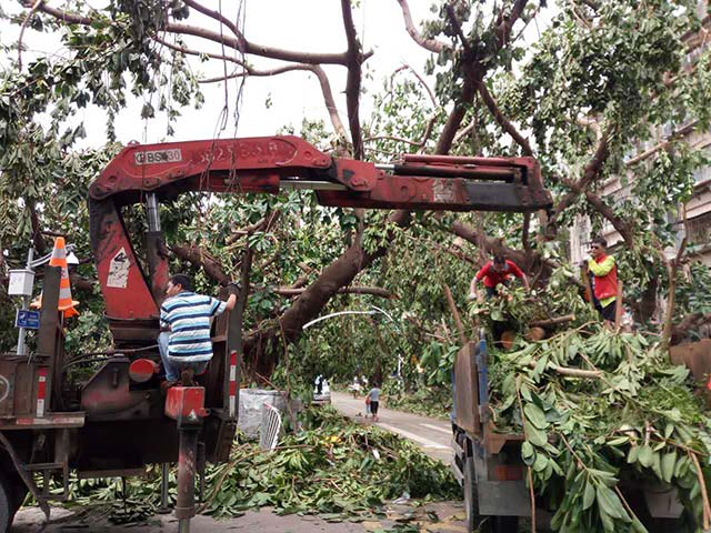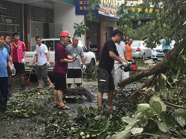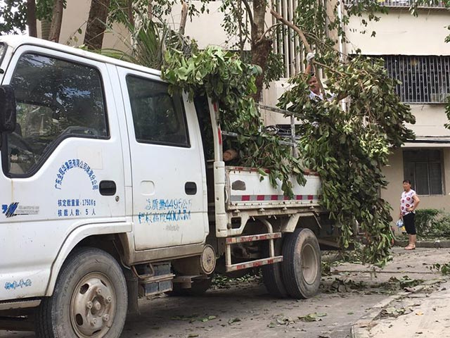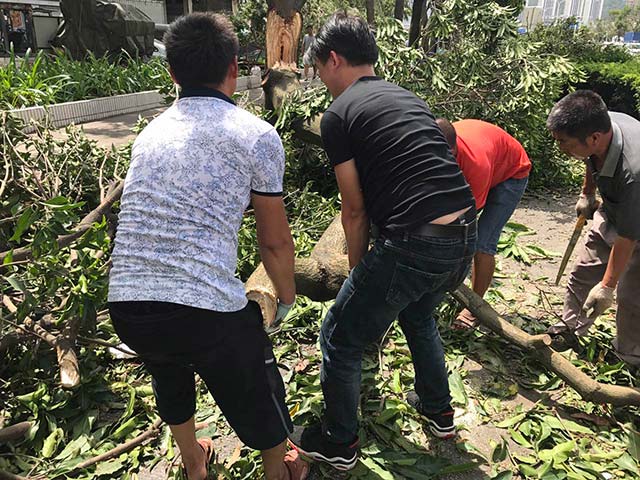 2017年8月23日中午12點50分,第13號臺風(fēng)“天鴿”正面襲擊珠海市,大批樹木被攔腰折斷或連根拔起,造成大部分主干道堵塞,嚴(yán)重影響當(dāng)?shù)鼐用窆ぷ骱蜕睢!疤鞛?zāi)無情人有情”,我集團(tuán)珠海公司在獲悉災(zāi)情后,迅速行動,組織人員和車輛,全力以赴針對突出的受阻道路進(jìn)行清理工作。在安平路、桃園路、海虹路、東風(fēng)路等路段,隨處可見殘樹斷枝錯亂橫陳,珠海公司員工與當(dāng)?shù)鼐用褚黄鹎鍜呃嵋茦淠尽V钡皆撀范吻逭瞎ぷ魍瓿桑缆方煌ɑ净謴?fù)。