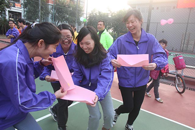 本次趣味運動會采取大學生村官和金輝華集團黨團員代表混合組隊的形式,組成4隊開展比賽。比賽項目有齊心協力、二人三足接力、搶凳仔、義氣踢毽和全心傳意。