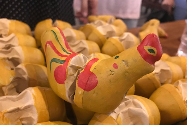 開平市水口鎮聯竹鄉制作鎮濠泥雞玩具已有二百多年歷史,以前每到農歷春節前夕,來自鶴山、臺山、恩平、新會等地的商販們便駕車來采購泥雞作年貨銷售。泥雞外形古樸、價格便宜,深受人們的喜愛。大年初一是雞日,大量泥雞上市,一時泥雞啼聲四起,給人們帶來歡欣和喜氣。